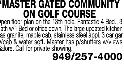 “MASTER GATED COMMUNITY ON GOLF COURSE Open floor plan on the 13th hole. Fantastic 4 Bed., 3 Bath w/1 Bed or office down. The large updated kitchen has granite, maple cab, stainless steel appl. 3 car gar w/cab & water soft. Master has p/shutters w/views Galore. Call for private showing. 949/257-4000 See also