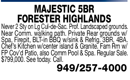 MAJESTIC 5BR FORESTER HIGHLANDS Never 2 Sty on Lg Cul-de-Sac. Prof. Landscaped grounds. Near Comm. walking path. Private Rear grounds w/ Spa, Firepit, BLT-in BBQ w/sink & Refrig. 3BR, 4BA. Chef’s Kitchen w/center island & Granite. Fam Rm w/ FP Cov’d Patio, also Comm Pool & Spa. Regular Sale. $799,000. See today. Call.