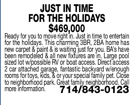 JUST IN TIME FOR THE HOLIDAYS $469,000 Ready for you to move right in. Just in time to entertain for the holidays. This charming 3BR, 2BA home has new carpet & paint & is waiting just for you. BA’s have been remodeled & all new fixtures are in. Large pool sized lot w/possible RV or boat access. Direct access 2 car attached garage, fantastic backyard w/enough rooms for toys, kids, & or your special family pet. Close to neighborhood park. Great family neighborhood. Call more information. 714/843-0123