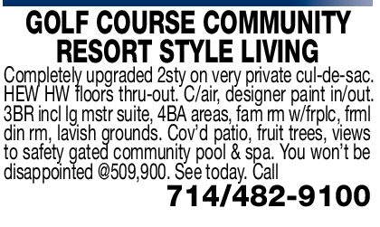 GOLF COURSE COMMUNITY RESORT STYLE LIVING Completely upgraded 2sty on very private cul-de-sac. HEW HW floors thru-out. C/air, designer paint in/out. 3BR incl lg mstr suite, 4BA areas, fam rm w/frplc, frml din rm, lavish grounds. Cov’d patio, fruit trees, views to safety gated community pool & spa. You won’t be disappointed @509,900. See today. Call 714/482-9100