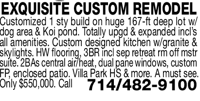 EXQUISITE CUSTOM REMODEL Customized 1 sty build on huge 167-ft deep lot w/ dog area & Koi pond. Totally upgd & expanded incl’s all amenities. Custom designed kitchen w/granite & skylights. HW flooring, 3BR incl sep retreat rm off mstr suite. 2BAs central air/heat, dual pane windows, custom FP, enclosed patio. Villa Park HS & more. A must see. Only $550,000. Call 714/482-9100