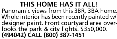 Panoramic views from this 3BR, 3BA home. Whole interior has been recently painted w/ designer paint. Front courtyard area overlooks the park & city lights. $350,000.