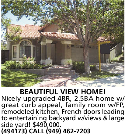 Nicely upgraded 4BR, 2.5BA home w/ great curb appeal, family room w/FP, remodeled kitchen, French doors leading to entertaining backyard w/views & large side yard! $490,000. (494173) CALL (949) 462-7203