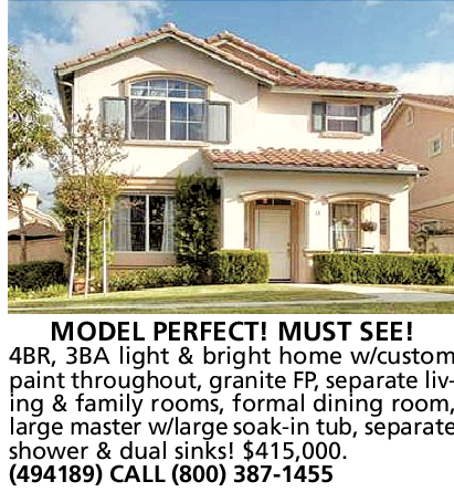 4BR, 3BA light & bright home w/custom paint throughout, granite FP, separate living & family rooms, formal dining room, large master w/large soak-in tub, separate shower & dual sinks! $415,000. (494189) CALL (800) 387-1455