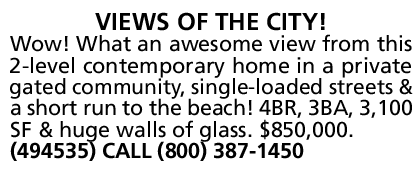 Wow! What an awesome view from this 2-level contemporary home in a private gated community, single-loaded streets & a short run to the beach! 4BR, 3BA, 3,100 SF & huge walls of glass. $850,000. (494535) CALL (800) 387-1450