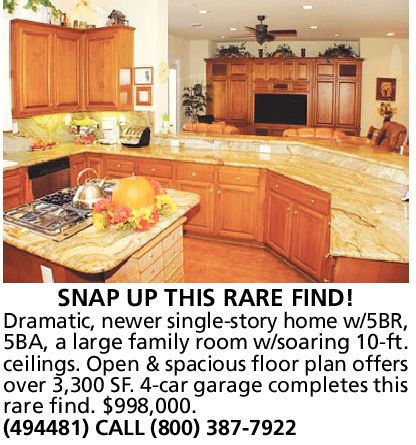 Dramatic, newer single-story home w/5BR, 5BA, a large family room w/soaring 10-ft. ceilings. Open & spacious floor plan offers over 3,300 SF. 4-car garage completes this rare find. $998,000. (494481) CALL (800) 387-7922