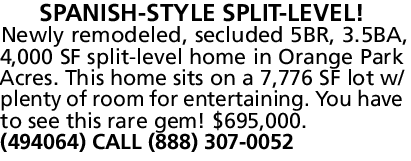 Newly remodeled, secluded 5BR, 3.5BA, 4,000 SF split-level home in Orange Park Acres. This home sits on a 7,776 SF lot w/ plenty of room for entertaining. You have to see this rare gem! $695,000. (494064) CALL (888) 307-0052