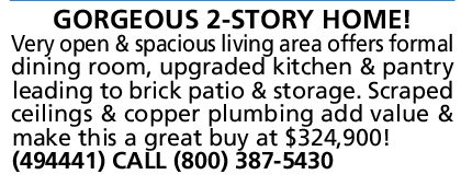 Very open & spacious living area offers formal dining room, upgraded kitchen & pantry leading to brick patio & storage. Scraped ceilings & copper plumbing add value & make this a great buy at $324,900! (494441) CALL (800) 387-5430