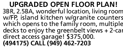 3BR, 2.5BA, wonderful location, living room w/FP, island kitchen w/granite counters which opens to the family room, multiple decks to enjoy the greenbelt views + 2-car direct access garage! $375,000.