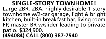 Large 2BR, 2BA, highly desirable 1-story townhome w/2-car garage, light & bright kitchen, built-in breakfast bar, living room FP, master BR w/slider leading to private patio. $324,900. (494084) CALL (800) 387-7940