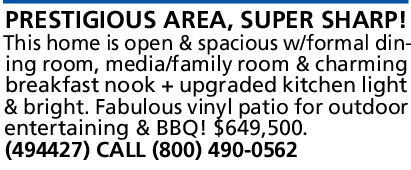 PRESTIGIOUS AREA, SUPER SHARP! This home is open & spacious w/formal dining room, media/family room & charming breakfast nook + upgraded kitchen light & bright. Fabulous vinyl patio for outdoor entertaining & BBQ! $649,500. (494427) CALL (800) 490-0562