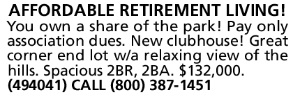 You own a share of the park! Pay only association dues. New clubhouse! Great corner end lot w/a relaxing view of the hills. Spacious 2BR, 2BA. $132,000. (494041) CALL (800) 387-1451