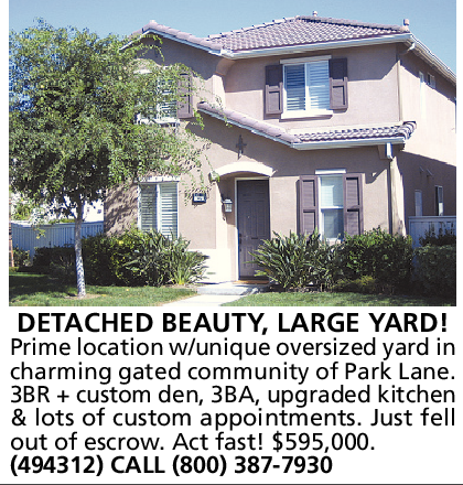 DETACHED BEAUTY, LARGE YARD! Prime location w/unique oversized yard in charming gated community of Park Lane. 3BR + custom den, 3BA, upgraded kitchen & lots of custom appointments. Just fell out of escrow. Act fast! $595,000. (494312) CALL (800) 387-7930