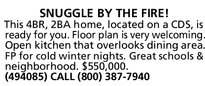 This 4BR, 2BA home, located on a CDS, is ready for you. Floor plan is very welcoming. Open kitchen that overlooks dining area. FP for cold winter nights. Great schools & neighborhood. $550,000. (494085) CALL (800) 387-7940