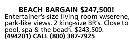 Entertainer’s-size living room w/serene, park-like views. 2 king-size BR’s. Close to pool, spa & the beach. $243,500. (494201) CALL (800) 387-7925
