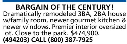 Dramatically remodeled 3BA, 2BA house w/family room, newer gourmet kitchen & newer windows. Premier interior oversized lot. Close to the park. $474,900. (494203) CALL (800) 387-7925