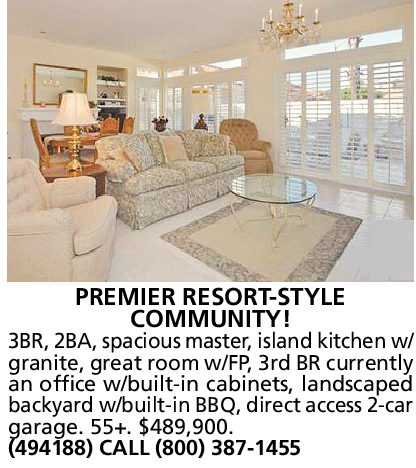3BR, 2BA, spacious master, island kitchen w/ granite, great room w/FP, 3rd BR currently an office w/built-in cabinets, landscaped backyard w/built-in BBQ, direct access 2-car garage. 55+. $489,900. (494188) CALL (800) 387-1455