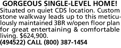 Situated on quiet CDS location. Custom stone walkway leads up to this meticulously maintained 3BR w/open floor plan for great entertaining & comfortable living. $624,900. (494522) CALL (800) 387-1454