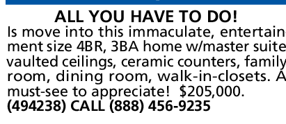 Is move into this immaculate, entertainment size 4BR, 3BA home w/master suite, vaulted ceilings, ceramic counters, family room, dining room, walk-in-closets. A must-see to appreciate! $205,000. (494238) CALL (888) 456-9235