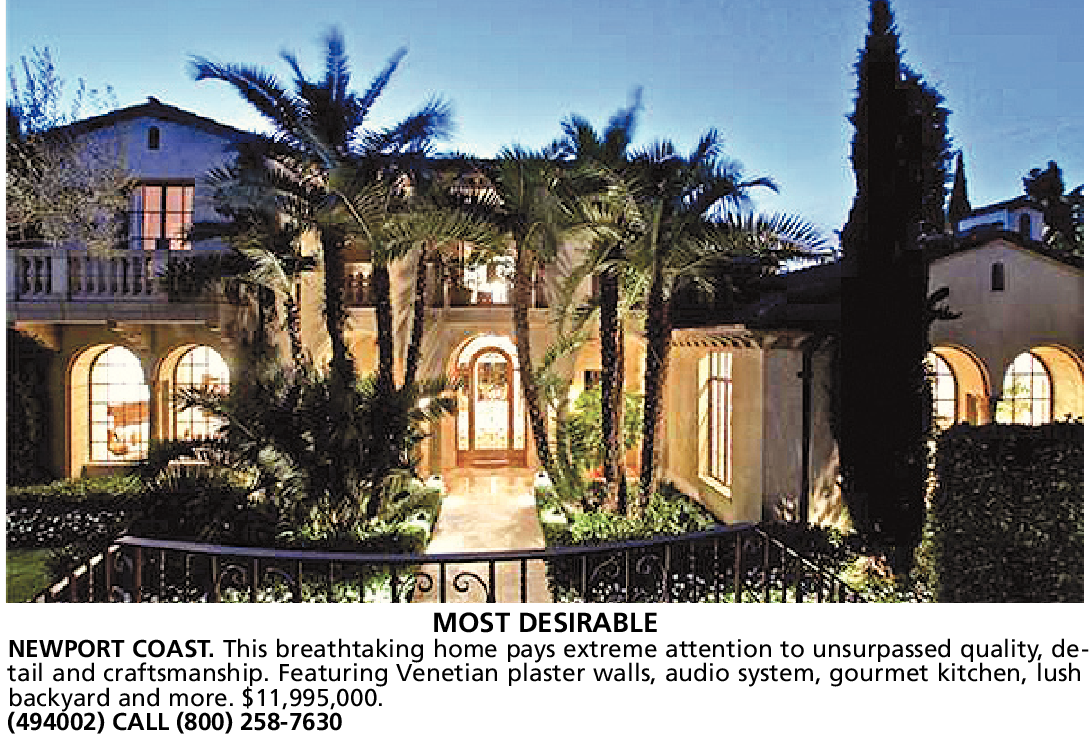MOST DESIRABLE NEWPORT COAST. This breathtaking home pays extreme attention to unsurpassed quality, detail and craftsmanship. Featuring Venetian plaster walls, audio system, gourmet kitchen, lush backyard and more. $11,995,000. (494002) CALL (800) 258-7630