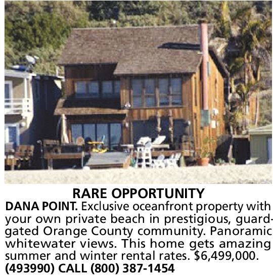 RARE OPPORTUNITY DANA POINT. Exclusive oceanfront property with your own private beach in prestigious, guardgated Orange County community. Panoramic whitewater views. This home gets amazing summer and winter rental rates. $6,499,000. (493990) CALL (800) 387-1454