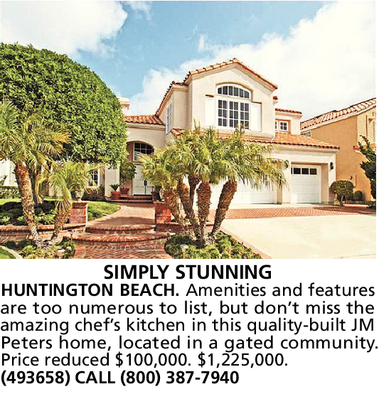 SIMPLY STUNNING HUNTINGTON BEACH. Amenities and features are too numerous to list, but don’t miss the amazing chef’s kitchen in this quality-built JM Peters home, located in a gated community. Price reduced $100,000. $1,225,000. (493658) CALL (800) 387-7940