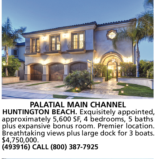 PALATIAL MAIN CHANNEL HUNTINGTON BEACH. Exquisitely appointed, approximately 5,600 SF, 4 bedrooms, 5 baths plus expansive bonus room. Premier location. Breathtaking views plus large dock for 3 boats. $4,750,000. (493916) CALL (800) 387-7925
