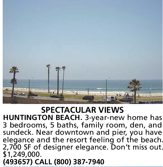 SPECTACULAR VIEWS HUNTINGTON BEACH. 3-year-new home has 3 bedrooms, 5 baths, family room, den, and sundeck. Near downtown and pier, you have elegance and the resort feeling of the beach. 2,700 SF of designer elegance. Don’t miss out. $1,249,000. (493657) CALL (800) 387-7940