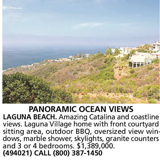 PANORAMIC OCEAN VIEWS LAGUNA BEACH. Amazing Catalina and coastline views. Laguna Village home with front courtyard sitting area, outdoor BBQ, oversized view windows, marble shower, skylights, granite counters and 3 or 4 bedrooms. $1,389,000. (494021) CALL (800) 387-1450