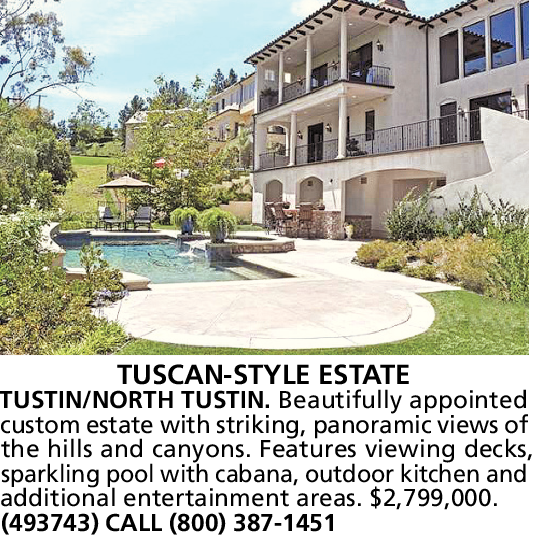 TUSCAN-STYLE ESTATE TUSTIN/NORTH TUSTIN. Beautifully appointed custom estate with striking, panoramic views of the hills and canyons. Features viewing decks, sparkling pool with cabana, outdoor kitchen and additional entertainment areas. $2,799,000.