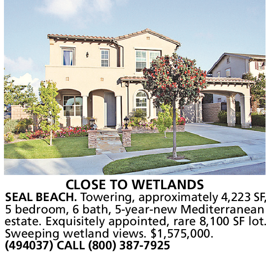 CLOSE TO WETLANDS SEAL BEACH. Towering, approximately 4,223 SF, 5 bedroom, 6 bath, 5-year-new Mediterranean estate. Exquisitely appointed, rare 8,100 SF lot. Sweeping wetland views. $1,575,000. (494037) CALL (800) 387-7925