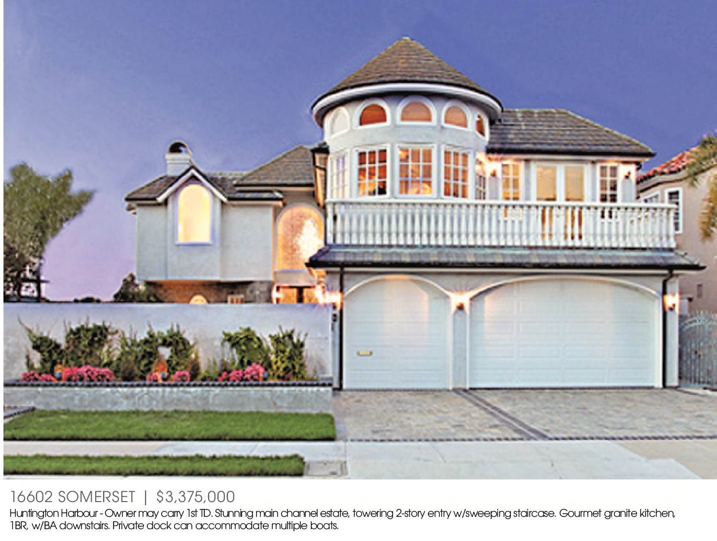 16602 SOMERSET | $3,375,000 Huntington Harbour - Owner may carry 1st TD. Stunning main channel estate, towering 2-story entry w/sweeping staircase. Gourmet granite kitchen, 1BR, w/BA downstairs. Private dock can accommodate multiple boats.