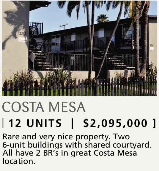 Rare and very nice property. Two 6-unit buildings with shared courtyard. All have 2 BR’s in great Costa Mesa location.
