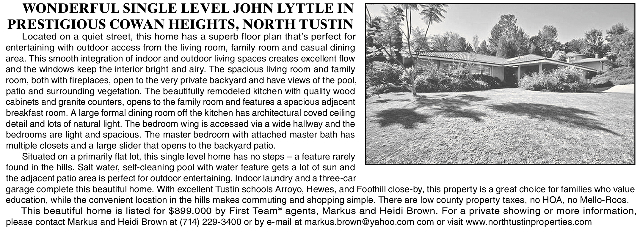 WONDERFUL SINGLE LEVEL JOHN LYTTLE IN PRESTIGIOUS COWAN HEIGHTS, NORTH TUSTIN Located on a quiet street, this home has a superb floor plan that’s perfect for entertaining with outdoor access from the living room, family room and casual dining area. This smooth integration of indoor and outdoor living spaces creates excellent fl ow and the windows keep the interior bright and airy. The spacious living room and family room, both with fireplaces, open to the very private backyard and have views of the pool, patio and surrounding vegetation. The beautifully remodeled kitchen with quality wood cabinets and granite counters, opens to the family room and features a spacious adjacent breakfast room. A large formal dining room off the kitchen has architectural coved ceiling detail and lots of natural light. The bedroom wing is accessed via a wide hallway and the bedrooms are light and spacious. The master bedroom with attached master bath has multiple closets and a large slider that opens to the backyard patio. Situated on a primarily flat lot, this single level home has no steps – a feature rarely found in the hills. Salt water, self-cleaning pool with water feature gets a lot of sun and the adjacent patio area is perfect for outdoor entertaining. Indoor laundry and a three-car garage complete this beautiful home. With excellent Tustin schools Arroyo, Hewes, and Foothill close-by, this property is a great choice for families who value education, while the convenient location in the hills makes commuting and shopping simple. There are low county property taxes, no HOA, no Mello-Roos. This beautiful home is listed for $899,000 by First Team ® agents, Markus and Heidi Brown. For a private showing or more information, please contact Markus and Heidi Brown at (714) 229-3400 or by e-mail at markus.brown@yahoo.com com or visit www.northtustinproperties.com