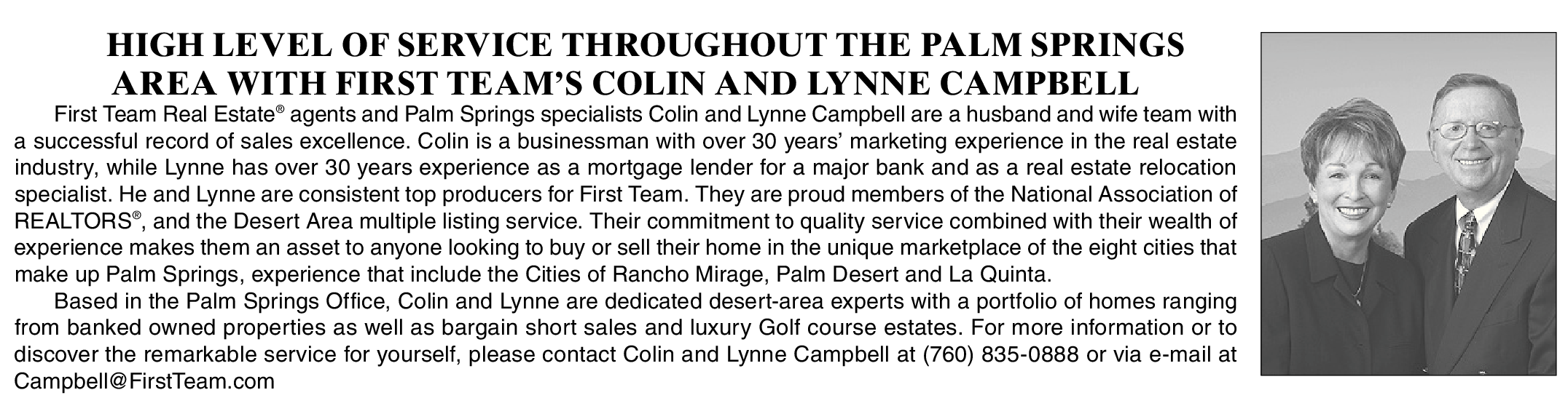 HIGH LEVEL OF SERVICE THROUGHOUT THE PALM SPRINGS AREA WITH FIRST TEAM’S COLIN AND LYNNE CAMPBELL First Team Real Estate ® agents and Palm Springs specialists Colin and Lynne Campbell are a husband and wife team with a successful record of sales excellence. Colin is a businessman with over 30 years’ marketing experience in the real estate industry, while Lynne has over 30 years experience as a mortgage lender for a major bank and as a real estate relocation specialist. He and Lynne are consistent top producers for First Team. They are proud members of the National Association of REALTORS ® , and the Desert Area multiple listing service. Their commitment to quality service combined with their wealth of experience makes them an asset to anyone looking to buy or sell their home in the unique marketplace of the eight cities that make up Palm Springs, experience that include the Cities of Rancho Mirage, Palm Desert and La Quinta. Based in the Palm Springs Office, Colin and Lynne are dedicated desert-area experts with a portfolio of homes ranging from banked owned properties as well as bargain short sales and luxury Golf course estates. For more information or to discover the remarkable service for yourself, please contact Colin and Lynne Campbell at (760) 835-0888 or via e-mail at Campbell@FirstTeam.com