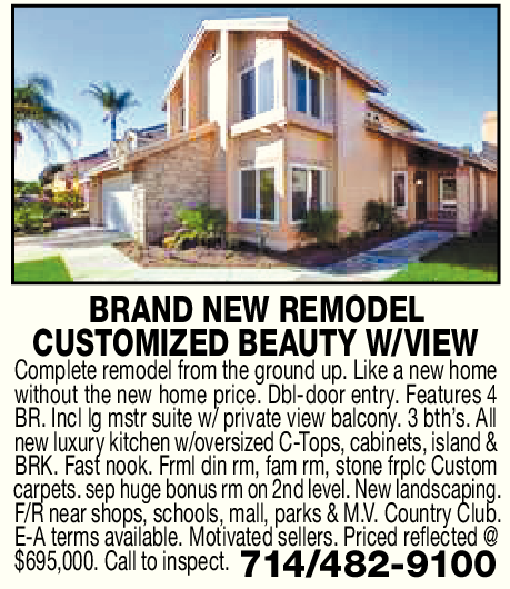 BRAND NEW REMODEL CUSTOMIZED BEAUTY W/VIEW Complete remodel from the ground up. Like a new home without the new home price. Dbl-door entry. Features 4 BR. Incl lg mstr suite w/ private view balcony. 3 bth’s. All new luxury kitchen w/oversized C-Tops, cabinets, island & BRK. Fast nook. Frml din rm, fam rm, stone frplc Custom carpets. sep huge bonus rm on 2nd level. New landscaping. F/R near shops, schools, mall, parks & M.V. Country Club. E-A terms available. Motivated sellers. Priced reflected @ $695,000. Call to inspect. 714/482-9100