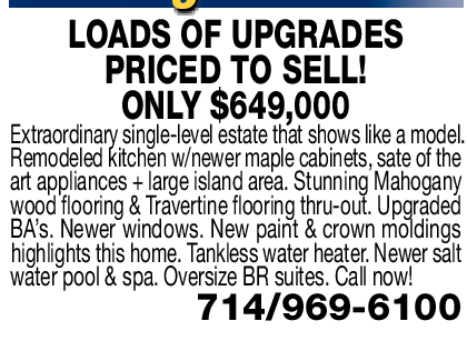 LOADS OF UPGRADES PRICED TO SELL! ONLY $649,000 Extraordinary single-level estate that shows like a model. Remodeled kitchen w/newer maple cabinets, sate of the art appliances + large island area. Stunning Mahogany wood flooring & Travertine flooring thru-out. Upgraded BA’s. Newer windows. New paint & crown moldings highlights this home. Tankless water heater. Newer salt water pool & spa. Oversize BR suites. Call now! 714/969-6100