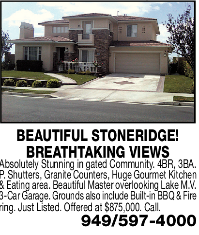 BREATHTAKING VIEWS Absolutely Stunning in gated Community. 4BR, 3BA. P. Shutters, Granite Counters, Huge Gourmet Kitchen & Eating area. Beautiful Master overlooking Lake M.V. 3-Car Garage. Grounds also include Built-in BBQ & Fire ring. Just Listed. Offered at $875,000. Call.
