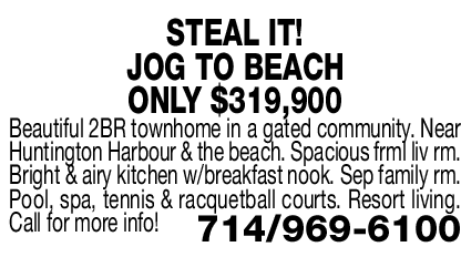 JOG TO BEACH ONLY $319,900 Beautiful 2BR townhome in a gated community. Near Huntington Harbour & the beach. Spacious frml liv rm. Bright & airy kitchen w/breakfast nook. Sep family rm. Pool, spa, tennis & racquetball courts. Resort living. Call for more info! 714/969-6100