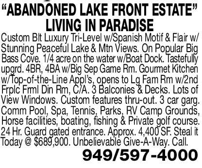 “ABANDONED LAKE FRONT ESTATE” LIVING IN PARADISE Custom Blt Luxury Tri-Level w/Spanish Motif & Flair w/ Stunning Peaceful Lake & Mtn Views. On Popular Big Bass Cove. 1/4 acre on the water w/Boat Dock. Tastefully upgrd. 4BR, 4BA w/Big Sep Game Rm. Gourmet Kitchen w/Top-of-the-Line Appl’s, opens to Lg Fam Rm w/2nd Frplc Frml Din Rm, C/A. 3 Balconies & Decks. Lots of View Windows. Custom features thru-out. 3 car garg. Comm Pool, Spa, Tennis, Parks, RV Camp Grounds, Horse facilities, boating, fishing & Private golf course. 24 Hr. Guard gated entrance. Approx. 4,400 SF. Steal it Today @ $689,900. Unbelievable Give-A-Way. Call. 949/597-4000 See also
