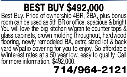 BEST BUY $492,000 Best Buy. Pride of ownership 4BR, 2BA, plus bonus room can be used as 5th BR or office, spacious & bright. You will love the big kitchen w/granite counter tops & glass cabinets, crown molding throughout, hardwood flooring, newly remodeled BA, extra sized lot & back yard w/patio covering for you to enjoy. So affordable w/interest rates at a 50 year low, easy to qualify. Call for more information. $492,000. 714/964-2121 See also