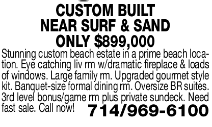 CUSTOM BUILT NEAR SURF & SAND ONLY $899,000 Stunning custom beach estate in a prime beach location. Eye catching liv rm w/dramatic fireplace & loads of windows. Large family rm. Upgraded gourmet style kit. Banquet-size formal dining rm. Oversize BR suites. 3rd level bonus/game rm plus private sundeck. Need fast sale. Call now! 714/969-6100