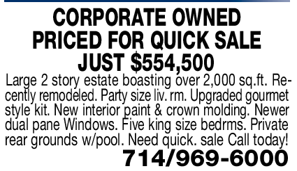 CORPORATE OWNED PRICED FOR QUICK SALE JUST $554,500 Large 2 story estate boasting over 2,000 sq.ft. Recently remodeled. Party size liv. rm. Upgraded gourmet style kit. New interior paint & crown molding. Newer dual pane Windows. Five king size bedrms. Private rear grounds w/pool. Need quick. sale Call today! 714/969-6000
