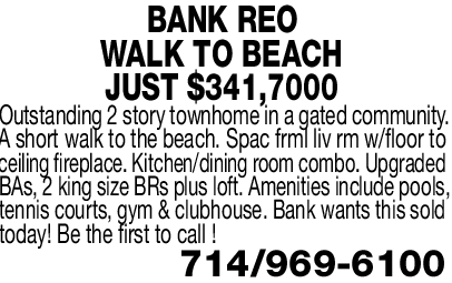 BANK REO WALK TO BEACH JUST $341,7000 Outstanding 2 story townhome in a gated community. A short walk to the beach. Spac frml liv rm w/floor to ceiling fireplace. Kitchen/dining room combo. Upgraded BAs, 2 king size BRs plus loft. Amenities include pools, tennis courts, gym & clubhouse. Bank wants this sold today! Be the first to call ! 714/969-6100 See also