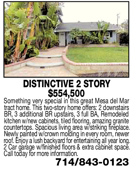 DISTINCTIVE 2 STORY $554,500 Something very special in this great Mesa del Mar tract home. This two-story home offers: 2 downstairs BR, 3 additional BR upstairs, 3 full BA, Remodeled kitchen w/new cabinets, tiled flooring, amazing granite countertops. Spacious living area w/striking fireplace. Newly painted w/crown molding in every room, newer roof. Enjoy a lush backyard for entertaining all year long. 2 Car garage w/finished floors & extra cabinet space. Call today for more information. 714/843-0123 See also