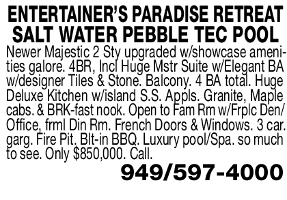 ENTERTAINER’S PARADISE RETREAT SALT WATER PEBBLE TEC POOL Newer Majestic 2 Sty upgraded w/showcase amenities galore. 4BR, Incl Huge Mstr Suite w/Elegant BA w/designer Tiles & Stone. Balcony. 4 BA total. Huge Deluxe Kitchen w/island S.S. Appls. Granite, Maple cabs. & BRK-fast nook. Open to Fam Rm w/Frplc Den/ Office, frml Din Rm. French Doors & Windows. 3 car. garg. Fire Pit. Blt-in BBQ. Luxury pool/Spa. so much to see. Only $850,000. Call.