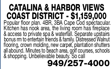 CATALINA & HARBOR VIEWS COAST DISTRICT - $1,159,000 Popular floor plan. 4BR, 3BA Cape Cod spectacular. Kitchen has nook area, the living room has fireplace & access to private spa & waterfall. Separate upstairs bonus rm to entertain friends & family. Distressed Walnut flooring, crown molding, new carpet, plantation shutters all abound. Minutes to beach area, golf courses, schools & shopping. Unbelievable beauty. So call 949/257-4000