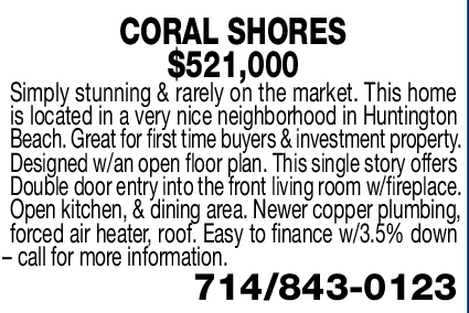 CORAL SHORES $521,000 Simply stunning & rarely on the market. This home is located in a very nice neighborhood in Huntington Beach. Great for first time buyers & investment property. Designed w/an open floor plan. This single story offers Double door entry into the front living room w/fireplace. Open kitchen, & dining area. Newer copper plumbing, forced air heater, roof. Easy to finance w/3.5% down – call for more information. 714/843-0123 See also