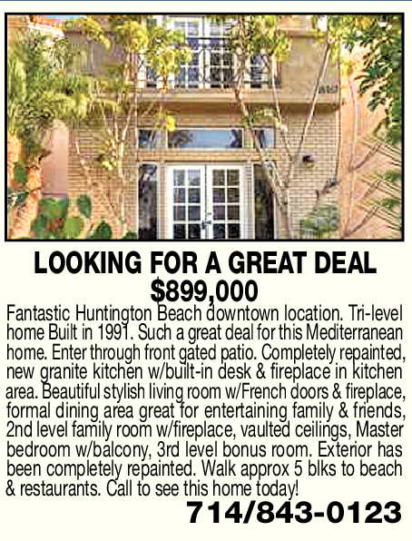 LOOKING FOR A GREAT DEAL $899,000 Fantastic Huntington Beach downtown location. Tri-level home Built in 1991. Such a great deal for this Mediterranean home. Enter through front gated patio. Completely repainted, new granite kitchen w/built-in desk & fireplace in kitchen area. Beautiful stylish living room w/French doors & fireplace, formal dining area great for entertaining family & friends, 2nd level family room w/fireplace, vaulted ceilings, Master bedroom w/balcony, 3rd level bonus room. Exterior has been completely repainted. Walk approx 5 blks to beach & restaurants. Call to see this home today! 714/843-0123 See also