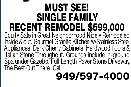 MUST SEE! SINGLE FAMILY RECENT REMODEL $599,000 Equity Sale in Great Neighborhood Nicely Remodeled inside & out. Gourmet Granite Kitchen w/Stainless Steel Appliances. Dark Cherry Cabinets. Hardwood floors & Italian Stone Throughout. Grounds include in-ground Spa under Gazebo. Full Length Paver Stone Driveway. The Best Out There. Call. 949/597-4000